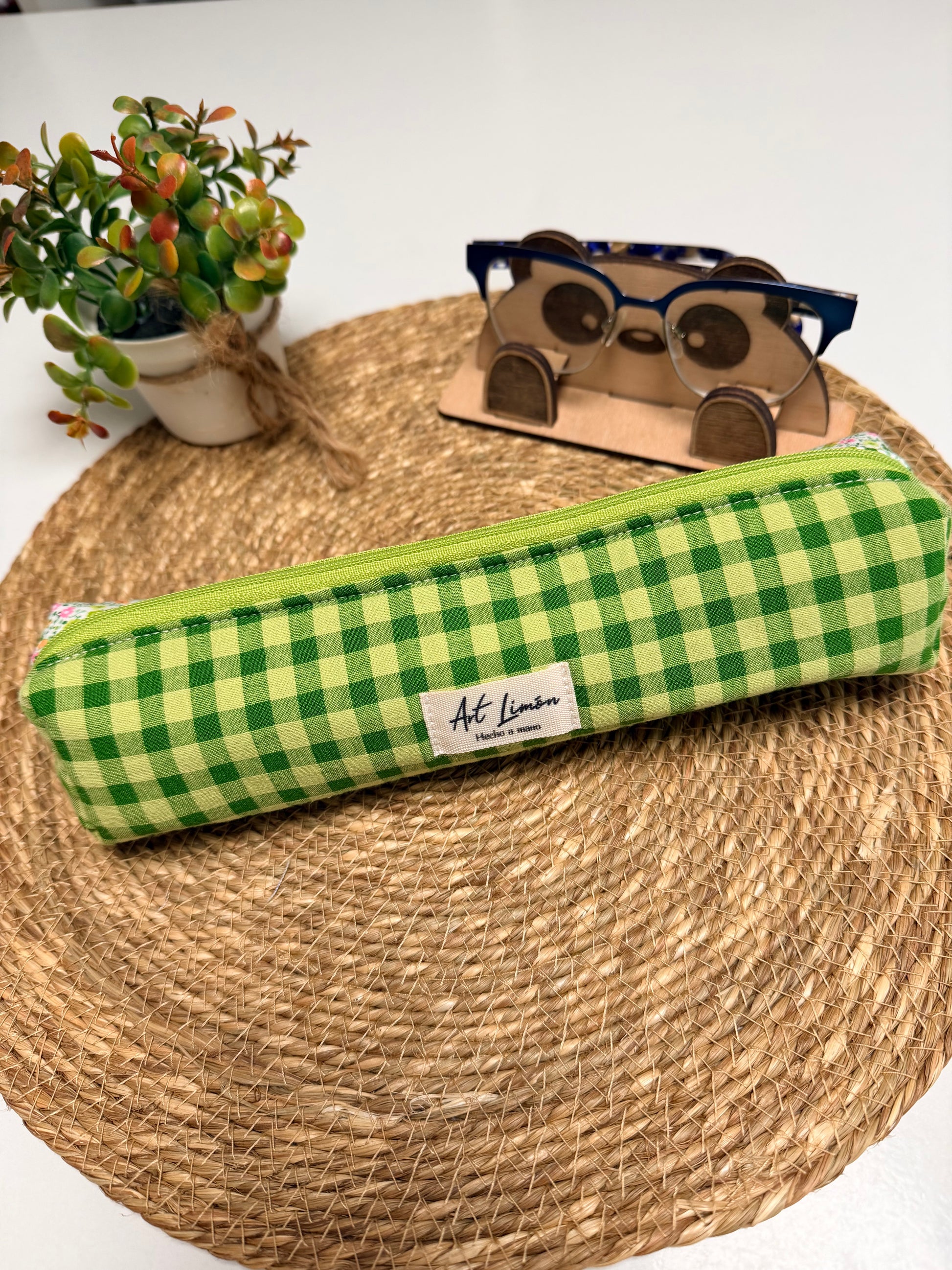 Estuche confeccionado con tela de cuadros verdes y detalles florales en tonos vivos con acolchado y forro, este accesorio combina lo clásico con un toque alegre y moderno.