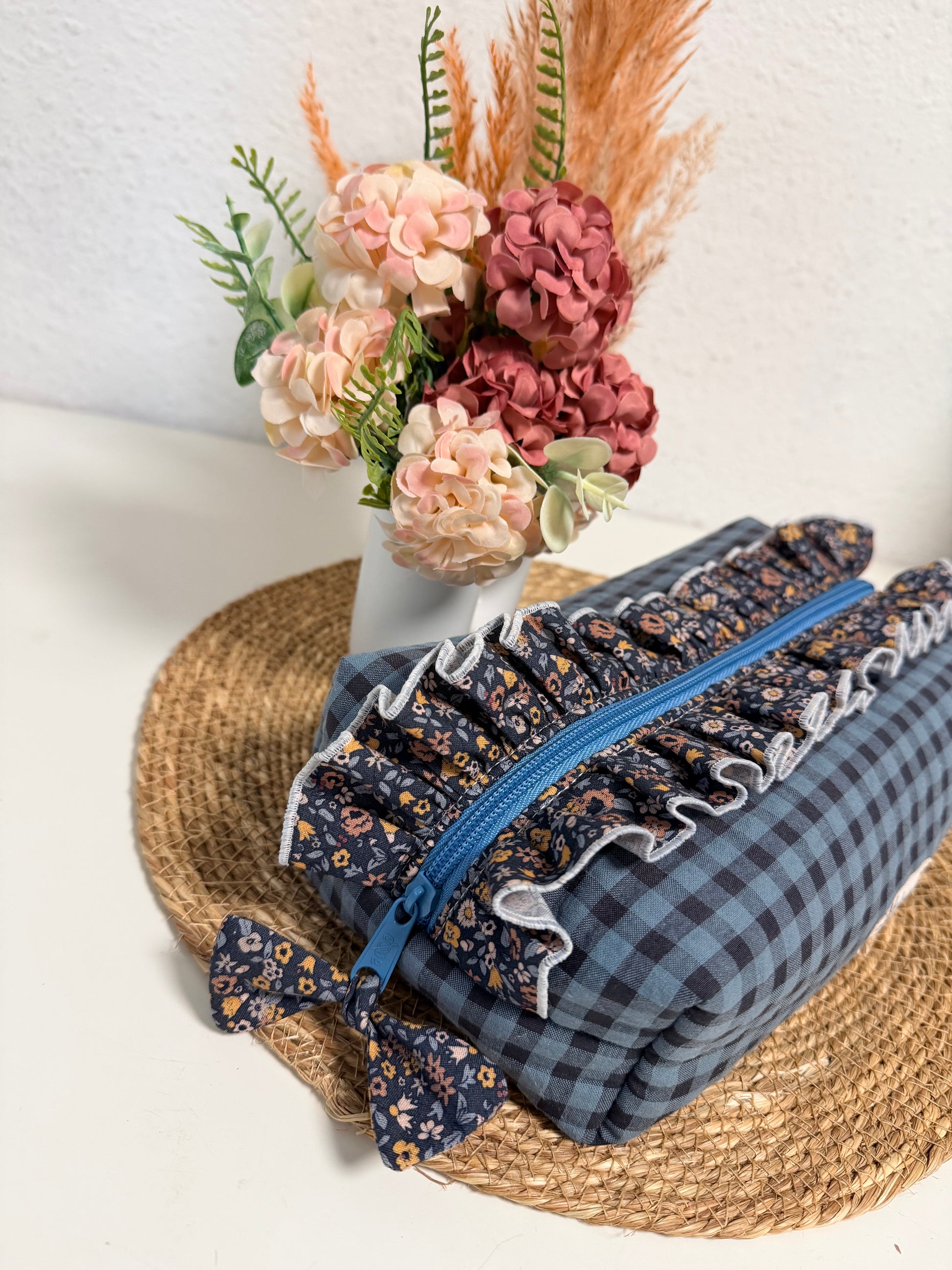 - Neceser amplio y ligero con estampado vichy azul grisáceo y negro.